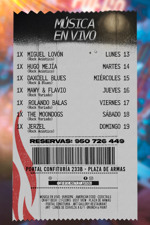 Cada noche, Fuego se convierte en un escenario donde la gastronomía y la música se fusionan. Disfruta de bandas en vivo con una propuesta musical diversa: chicha, jazz, blues, rock, folk, reggaeton y más.